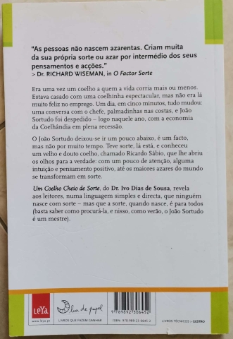 Inspirado no trabalho de Richard Wiseman, o Dr. Ivo Dias de Sousa (fomado em Gestão de Empresas e doutorado em Gestão de Informação) escreveu Um Coelho Cheio de Sorte, uma fábula intemporal sobre os reveses da fortuna e o modo de os superar. Numa linguagem acessível e imaginativa, o autor apresenta-nos um simpático coelho, João Sortudo, que nada faz pela sorte - até ao dia em que é despedido, e se vê obrigado a desenvolver uma nova postura perante a vida.