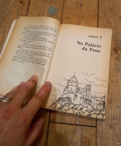 Sempre que abria a boca, dizia aldrabices. Infelizmente era linda... Os rapazes ficaram encantados, quiseram acompanhá-la ao Palácio da Pena. Aí conheceram o velho Sr. Raposo, que lhes contou histórias de arrepiar os cabelos: a lenda do tritão, um homem marinho com as pernas cobertas de escamas; a lenda do fantasma rei artista que se passeia de sala em sala aos suspiros de saudade nas noites de tempestade.