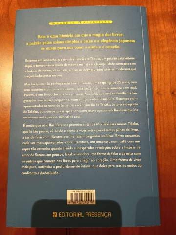 Esta é uma história em que a magia dos livros, a paixão pelas coisas simples e belas e a elegância japonesa se unem para nos tocar a alma e o coração. Estamos em Jimbocho, o bairro das livrarias de Tóquio, um paraíso para leitores. Aqui, o tempo não se mede da mesma maneira e a tranquilidade contrasta com o bulício do metro, ali ao lado, e com os desmesurados prédios modernos que traçam linhas retas no céu.