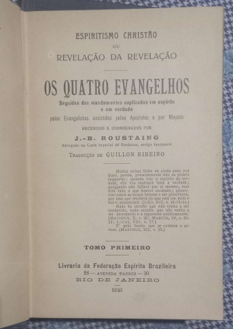 Os quatro Evangelhos, seguidos dos mandamentos explicados em espírito e verdade, pelos evangelistas assistidos pelos apóstolos. Recolhidos e colocados em ordem por J.B.Roustaing, advogado da corte imperial de Bordeaux, antigo chefe da ordem dos advogados.