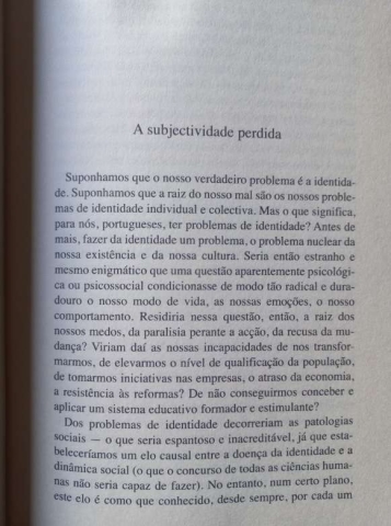 O autor de Portugal Hoje: O Medo de Existir considera que «fizemos da identidade o território da sujectividade» e «esforçamo-nos por resistir ao "fora" que aí vem, do exterior ou do interior, que ameaça destruir as nossas velhas subjectividades». Em sua opinião, a única maneira de remover o obstáculo da «identidade» é «deixarmos de ser primeiro portugueses para poder existir primeiro como homens».
