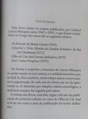 Este volume reúne os contos escritos por Gabriel García Márquez desde os finais dos anos 1940, até meados dos anos 1990. Um conjunto de 41 histórias que nos permite desfrutar de todo o encanto e mestria do genial escritor colombiano, e que nos leva a um mundo inesquecível cuja realidade se expressa mediante fórmulas mágicas e lendárias.