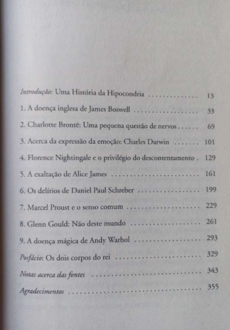 Biografias de nove hipocondríacos famosos - Alice James, Andy Warhol, Charlotte Brontë, Charles Darwin, Daniel Paul Schreber, Florence Nightingale, Glenn Gould, James Boswell, Marcel Proust - e o que as suas vidas nos dizem sobre o funcionamento da mente, com e contra o corpo. As suas descobertas são estimulantes e surpreendentes, e as histórias que o autor conta são muitas vezes comoventes, por vezes hilariantes e sempre arrebatadoras.