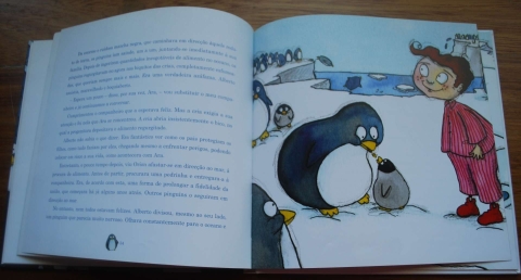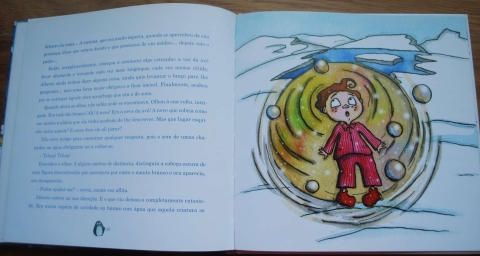 "Quando abriu os olhos, não sabia onde se encontrava. Olhou à sua volta, intrigado. Era tudo tão branco! Ah! A neve! Era a neve da avó! A neve que cobria como um manto a aldeia que ela tinha acabado de lhe descrever. Mas que lugar esquisito seria aquele? E como fora ele ali parar? Não teve tempo para encontrar qualquer resposta, pois o som de umas chapadas na água obrigaram-no a voltar-se."