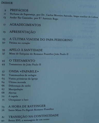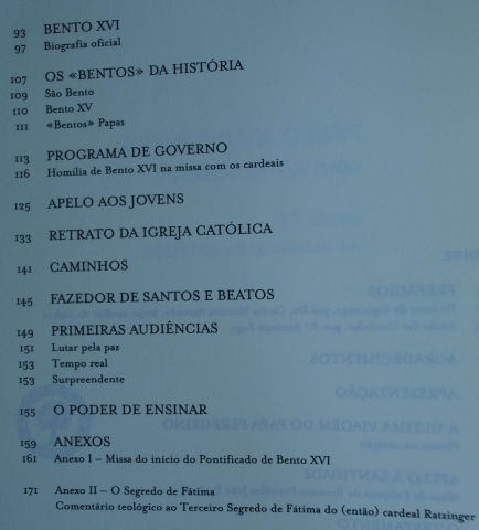 O livro inclui Prefácios do bispo auxiliar de Lisboa, Dr. Carlos Azevedo e do padre António Rego, o Testamento de João Paulo II, a Biografia e Programa de governo de Bento XVI, uma Mensagem de«o cardeal-patriarca de Lisboa, D. José Policarpo, textos de outros vultos da Igreja Portuguesa e um estudo teológico sobre o Terceiro Segredo de Fátima, pelo então ainda Cardeal Ratzinger