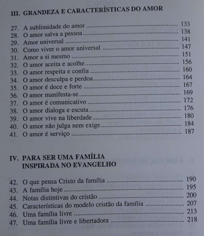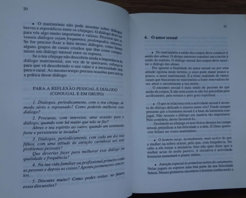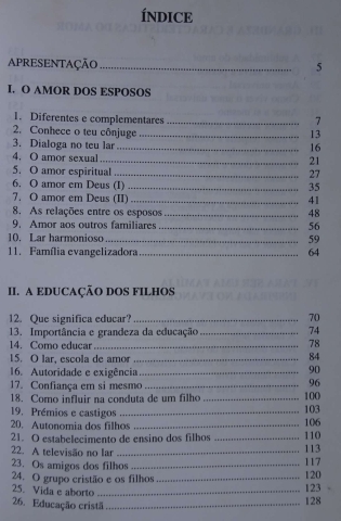 Em cada tema propõe algumas perguntas para facilitar a reflexão pessoal, conjugal e em grupo.