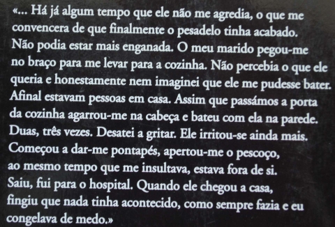 Há já algum tempo que ele não me agredia, o que me convencera de que finalmente o pesadelo tinha acabado. Não podia estar mais enganada. O meu marido pegou-me no braço para me levar para a cozinha. Não percebia o que ele queria e honestamente nem imaginei que ele me pudesse bater. Afinal estavam pessoas em casa. Assim que passámos a porta da cozinha agarrou-me na cabeça e bateu com ela na parede. Duas, três vezes. Desatei a gritar. Ele irritou-se ainda mais. Começou a dar-me pontapés, apertou-me o pescoço, ao mesmo tempo que me insultava, estava fora de si. Saiu, fui para o hospital. Quando ele chegou a casa, fingiu que nada tinha acontecido, como sempre fazia e eu congelava de medo.