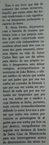Este é um livro que fala do romance das coisas invisíveis, daquilo que existe além das formas tradicionais e cujo significado vai lentamente perfurando o espírito do leitor.
