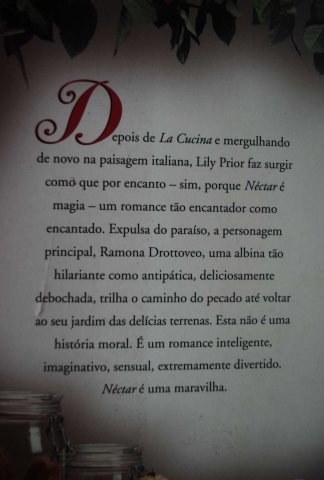 Depois de "La Cucina" e mergulhando de novo na paisagem italiana, Lily Prior faz surgir como que por encanto - sim, porque "Néctar" é magia - um romance tão encantador como encantado. Expulsa do paraíso, a personagem principal, Ramona Drottoveo, uma albina tão hilariante como antipática, deliciosamente debochada, trilha o caminho do pecado até voltar ao seu jardim das delícias terrenas. Esta não é uma história moral. É um romance inteligente, imaginativo, sensual, extremamente divertido. "Néctar" é uma maravilha!