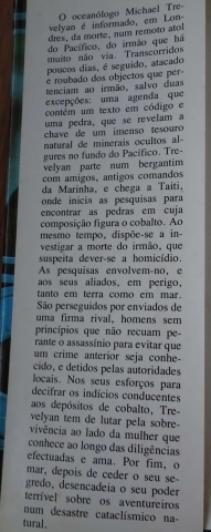 O oceanólogo Michael Trevelyan é informado, em Londres, da morte, num remoto atol do Pacífico, do irmão que há muito não via. Transcorridos poucos dias, é seguido, atacado e roubado dos objectos que pertenciam ao irmão, salvo duas exceções: uma agenda que contém um texto em código e uma pedra, que se revelam a chave de um imenso tesouro natural de minerais ocultos algures no fundo do Pacífico. Trevelyan parte num bergantim com amigos, antigos comandos da Marinha, e chega a Taiti, onde inicia as pesquisas para encontrar as pedras em cuja composição figura o cobalto. Ao mesmo tempo, dispõe-se a investigar a morte do irmão, que suspeita dever-se a homicídio. As pesquisas envolvem-no, e aos seus aliados, em perigo, tanto em terra como em mar. São perseguidos por enviados de uma firma rival, homens sem princípios que não recuam perante o assassínio para evitar que um crime anterior seja conhecido, e detidos pelas autoridades locais. Nos seus esforços para decifrar os indícios conducentes aos depósitos de cobalto, Trevelyan tem de lutar pela sobrevivência ao lado da mulher que conhece ao longo das diligências efetuadas e ama. Por fim, o mar, depois de ceder o seu segredo, desencadeia o seu poder terrível sobre os aventureiros num desastre cataclísmico natural.