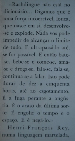 Rachdingue não está no dicionário...Digamos que é uma força incoercível, louca, que nasce em si, desenvolve-se e explode. Nada vos pode impedir de alcançar o limite de tudo. E ultrapassá-lo até, se for possível. E então bate-se, bebe-se e come-se, ama-se e droga-se, fala-se, fala-se, continua-se a falar. Isto pode durar de dez a cinquenta horas, até ao esgotamento. É a fuga perante a angústia. É o acaso da última sorte. É engolir o tempo e o espaço. E é negá-lo.