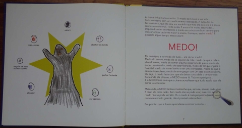 O medo dominava a vida da Joana. Começou por ser pequenino, por obrigá-la a fazer coisas pouco importantes e depois tornou-se cada vez mais poderoso. Pôs o seu corpo como se estivesse doente: o coração a bater depressa, as mãos a suarem e as pernas a tremerem. A Joana começou a ter medo de tudo, até de ter medo. Medo do escuro, medo de se separar da mãe, medo de comer alguma coisa fora do prazo, medo de andar de elevador, medo de estar fechada, medo de ter de ir para o hospital, medo de se engasgar. Enfim o Medo fazia com que ela sentisse a sua presença o tempo todo. Para onde a Joana olhasse, o Medo estava lá. Tudo era perigoso