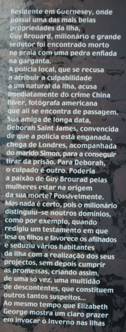 Residente em Guernesey, onde possui uma das mais belas propriedades da ilha, Guy Brouard, milionário de sessenta e nove anos e grande sedutor, continua a ignorar os rigores da idade e os banhos de mar em pleno mês de Dezembro não o assustam. Porém, um dia, o seu cadáver é encontrado na praia com uma pedra enfiada na garganta.