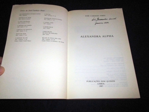 Primeira edição deste romance de José Cardoso Pires, que através das personagens centrais retrata a vida em Portugal desde a época da ditadura até ao período pós 25 de Abril de 1974. "Alexandra Alpha" antes de tudo se constituiu em intrigante e instigante «puzzle» que reúne ficção, poesia, música, cinema, história e política e Portugal e intervenção militar no território angolano. A obra destaca uma personagem, Alexandra, que dá o título ao romance, e sua irmã Maria, e através delas costuram-se referências a Fernando Pessoa, ao romance Uma Abelha na Chuva, de Carlos de Oliveira, à novela de Aquilino Ribeiro, à cinematografia de Fernando Lopes, à organização da linguagem cinematográfica, associadas ao levantamento e discussão de problemas sociais, morais e económicos de Portugal nos últimos vinte anos.