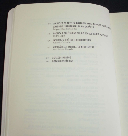 Textos de: Ana Godinho, António Guerreiro, Bruno C. Duarte, Delfim Sardo, Eduarda Neves, Joana Cunha Leal, Mariana Pinto dos Santos, João Pedro Cachopo, Jorge Figueira, José Gil, Margarida Medeiros, Maria Filomena Molder, Miguel Wandschneider, Pedro Lapa, Ricardo Carvalho e Rosa Maria Martelo.