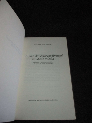 Introdução a "O Livro de cozinha”" da Infanta D. Maria de Portugal. Capa de brochura. Aqui se analisam os hábitos alimentares dos portugueses durante a Idade Média (séc. XII-XV). A utilização do pão, da carne, do peixe e do vinho, entre outros alimentos; a dependência onde cozinhavam com o seu pessoal; o número de refeições; a sala de jantar e cerimonial à mesa, são alguns dos aspectos apresentados neste livro.