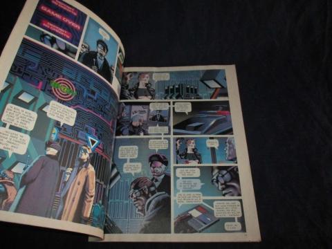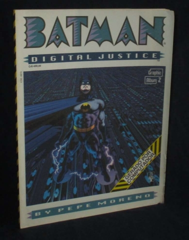 Capa de brochura. Digital Justice será comparada a visões distópicas como 1984, Admirável Mundo Novo e Blade Runner. Embora tenha elementos em comum com tudo isso, é algo mais – uma história em quadrinhos de suspense e alta aventura que comenta o poder redentor do mito. Enredo - No final do próximo século, quase toda a humanidade vive em enormes e extensas metrópoles. Cada faceta da existência humana é controlada por um vasto sistema informático chamado Net. Poucos sabem que este, por sua vez, é controlado por uma entidade insana conhecida como Coringa, cuja agenda é dominar toda a vida na Terra. Um policial solitário e furioso chamado James Gordon fica sabendo dos planos do Coringa, mas não pode fazer nada – não com os recursos de uma civilização inteira reunidos contra ele. Então ele descobre sua herança e nela os meios para combater o Coringa – a lenda de um misterioso vingador vestido de noite, O BATMAN.