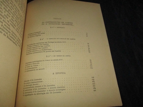 Capa de brochura. Ilustrado. Separata da História da Cultura em Portugal Vol. III. Documentado com várias gravuras reproduzindo as folhas de rosto das primitivas edições das obras de Camões, este importante trabalho tem como o índice: As Contradições de Camões ou o Humanismo Impossível; 1º Biografia; 2ª O conflito dos estilos em Camões; 3º Os temas da Lírica; 4º A Epopeia.