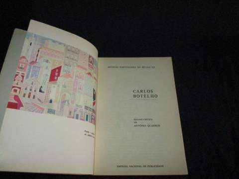 Estudo crítico. Brochado. Colecção dirigida por Júlio Gil. Ilustrado em extra texto com 8 reproduções de quadros do autor a cores impressas sobre papel couché. as últimas 63 páginas não numeradas apresentam 81 obras do autor, impressas a preto e branco. Carlos António Teixeira Basto Nunes Botelho (Lisboa, 1899 ?1982), foi pintor, ilustrador e caricaturista português. O seu trabalho repartiu-se por uma multiplicidade de actividades artísticas. Iniciou-se nos anos 20 do século passado na banda desenhada nacional, sendo um dos pioneiros deste género em Portugal, trabalhou também nessa altura em artes gráficas e no desenho de humor. Após viajar e ter entrado em contacto com a dinâmica artista da época na sua qualidade de decorador do SPN, desenvolveu uma obra plástica autónoma que o destaca como uma das maiores figuras da 2ª geração de pintores modernistas portugueses.