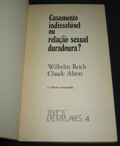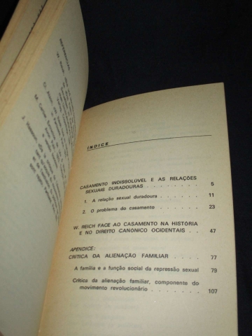 Do índice: Casamento indissolúvel e as relações sexuais duradouras; W. Reich face ao casamento na história e no direito canónico ocidentais; Apêndice: Crítica da alienação familiar: a família e a função social da repressão sexual, crítica de alienação familiar, componente do movimento revolucionário.