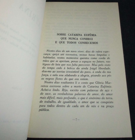 Da Abertura: “(...) Nestes dias exaltantes li o conto que Glória Marreiros escreveu sobre a morte de Catarina Eufémia. Acheio-o lindo. Rijo, escrito com palavras de aço e de suor, as verdadeiras palavras de amor, do amor mais difícil, mais profundo, o que é sinónimo de terra, de trabalho, de igualdade, o amor que se conquista para todos dentro de cada um de nós e na praça pública.