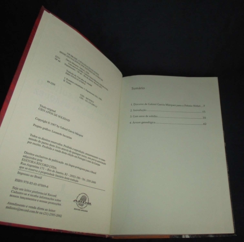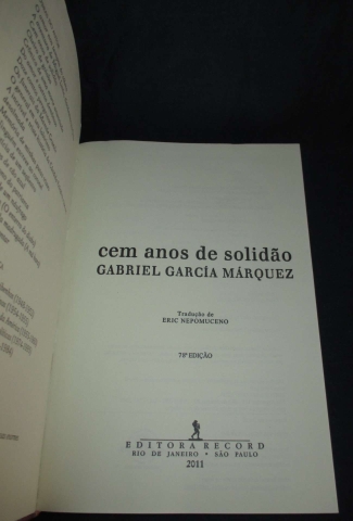 Assinatura de posse. Tradução de Eric Nepomuceno. A fabulosa aventura da família Buendía-Iguarán com os seus milagres, fantasias, obsessões, tragédias, incestos, adultérios, rebeldias, descobertas e condenações são a representação ao mesmo tempo do mito e da história, da tragédia e do amor do mundo inteiro. Árvore Genealógica.