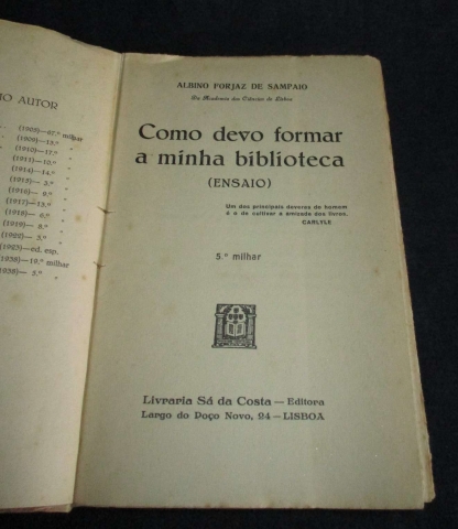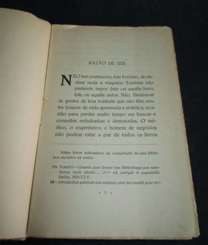 "Não tem pretensões, êste livrinho, de ensinar nada a ninguém. Também não pretende impor êste ou aquêle livro, êste ou aquêle autor. Não. Destina-se às gentes de boa vontade que não têm, nestes tempos de vida apressada e sintética, ocasião para perder muito tempo em buscas e consultas enfadonhas e demoradas. (...) Não é um catálogo. É a indicação de um milhar de volumes que é vergonha desconhecer, e sem o qual se não pode entender a gíria da cultura que escrevemos e falamos(...)". Referências a Camilo já na "Razão de ser" que abre o volume à maneira de prefácio.
