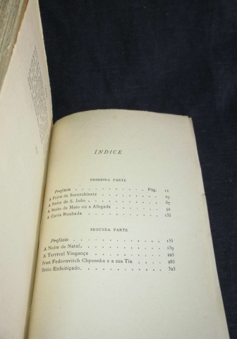 Traduzido por Fernandes Costa. Do índice: A Feira de Sorotchinetz, A Noite de S. João, A Noite de Maio ou a Afogada; A Carta Roubada; A Noite de Natal, A Terrível Vingança, Ivan Fedorovitch Chponnka e a sua Tia, Sítio Enfeitiçado.