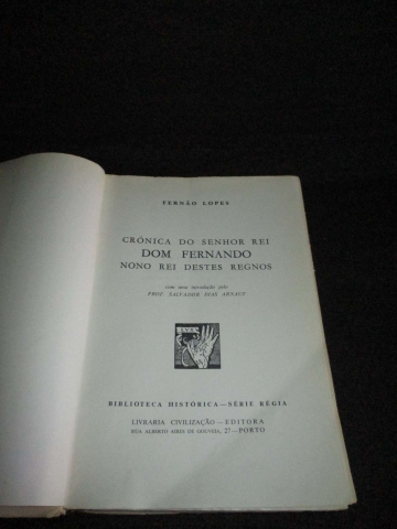 Capa de brochura. Crónica do Senhor Rei Dom Fernando Nono Rei Destes Regnos. Introdução pelo Prof. Salvador Dias Arnaut. Aparecida pela primeira vez em 1816 na "Collecção de Livros Ineditos da Historia Portugueza" e agora na prestimosa "Biblioteca Histórica - Série Régia", da Livraria Civilização.