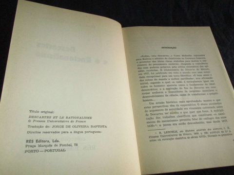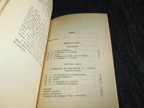 Assinatura de posse. Capa de brochura. Tradução de Jorge de Oliveira Baptista. Razão e método. A dúvida e o cogito. Deus. Liberdade e bom uso da razão. O homem e o mundo. A herança de Descartes. O ponto de partida cartesiano de Malebranche. As sementes cartesianas do espinozismo. O anticartesianismo de Leibniz. Os limites do cartesianismo. Cronologia bibliográfica.
