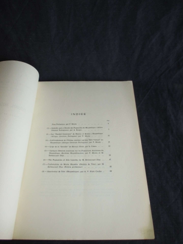 Do índice: Nota preliminar (F. Mouta); Subsídio para o Estudo das PEgmatites de Moçambique (A. Borges); Les Banded Ironstones de Manica et Sofala-Moçambique (F. Mouta); L'effondrement de l'Uréma, extrême sud des Rift Valleys au Moçambique (F. Mouta); L'âge de la davidite de MAvuzi (Tete) (L. Cahen); Qualques élèments nouveaux sur les Formations Anciennes du Moçambique (Sysème Moçambiquien) (F. Mouta); The Pegmatites of Alto Ligonha (M. Bettencourt Dias); Carbonatites do Monte Muambe (Distrito de Tete) (M. Bettencourt Dias); Anortositos de Tete (V. Pinto Coelho).