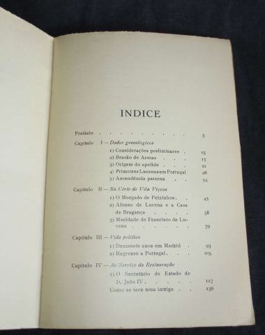 Do índice: Dados genealógicos; Na Côrte de Vila Viçosa; Vida política; Ao serviço da restauração; Da prisão ao cadafalso; Justiça póstuma; Conclusão.