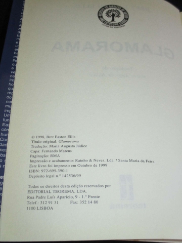 Tradução de Maria Augusta Júdice. "Bret Eastan Ellis já conquistou uma importante e original presença na literatura contemporânea. Agora, depois de Menos que Zero e Psicopata Americano, oferece-nos um romance onde faz um terrível balanço do século americano. Este romance leva-nos até ao bairro de Manhattan, onde um jovem obcecado com a moda e com as celebridades, descobre o lado obscuro dessa sociedade e constata que a realidade não é como a imaginava. Este romance confunde as nossas expectativas vezes sem conta; Ellis passa do cómico ao surreal, do horrendo ao humano com uma espantosa facilidade, fazendo uma combinação entre ambição e maturidade artística. Glamorama é, ao mesmo tempo, uma observação hilariante e brutal do mundo mas compassiva no seu olhar."