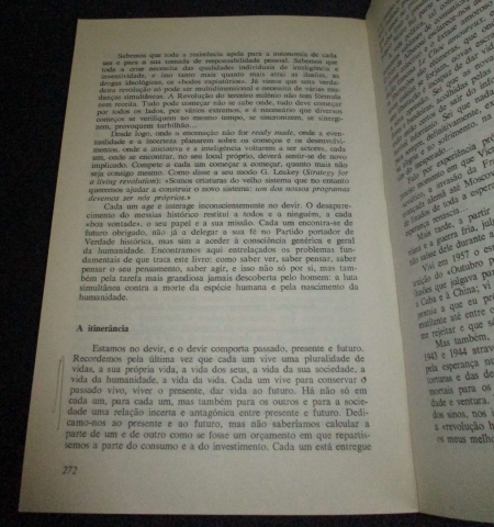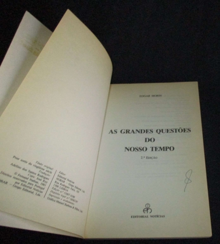 Assinatura de posse. Sublinhado. "Quem somos? Donde vimos? Para onde vamos? Temos respostas físicas, biológicas, antropológicas, sociológicas e históricas cada vez mais correctas a estas interrogações. Mas essas respostas não abrem interrogações muito mais vastas do que as que fecham? Vivemos num universo onde constantemente, às miríades, há estrelas que morrem, brilham, nascem e renascem. Somos seres físicos situados no terceiro satélite de um pequeno Sol da Via Láctea. Somos os seres biológicos mais cerebralmente desenvolvidos do ramo cerebralmente mais desenvolvido da evolução animal. Somos humanos da espécie chamada homo sapiens, para quem o problema, o enigma, o mistério maiores são a sua própria capacidade para resolver os problemas, esclarecer os enigmas, analisar os mistérios. Somos partes constitutivas, integradas, autónomas e ao mesmo tempo escravas de sociedades gigantescas chamadas nações. Estamos no quinquagésimo milénio — o quinto milésimo século — do futuro das sociedade humanas, no décimo milénio da aventura histórica das sociedades - Estados, e vamos talvez abeirar-nos do terceiro milénio da era cristã/ocidental.
