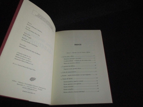 Capa de brochura. As nossas acções podem gerar karmas positivos, negativos ou neutros, dependendo do propósito das nossas acções. Através da prática da meditação podemos ter um domínio de nós próprios, procurando compreender com clareza as consequências das nossas emoções. Ao tomarmos consciência de que no universo nada surge ou se forma por si só, que tudo está em permanente transformação e muda a todo o instante, podemos então tranquilizar a nossa mente.Praticar meditação tendo a sabedoria como aliada é perceber que o mundo surge em função de causas e condições, que os elementos se juntam e se separam, produzindo e cessando todos os fenómenos. Os ensinamentos do budismo mostram-nos o caminho para a felicidade, isto é, conhecer as causas e condições para o surgimento ou desaparecimento dos fenómenos no universo, o praticante alcança serenidade, paz e tranquilidade, imprescindíveis à identificação do fluxo natural de todos os fenómenos. Espiritualidade Budismo.
