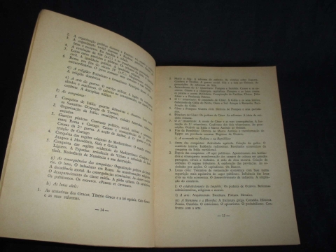 Volume I - Introdução, Conceito de História, Método da História; Antiguidade oriental, Fontes para conhecimento da vida dos povos desta época; Antiguidade clássica - Grécia, As condições geográficas e a sua influência; Antiguidade Clássica - Roma, As condições geográficas e a sua influência; Idade Média noção e características.