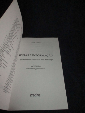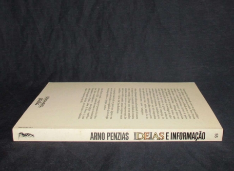 Operando num mundo de alta tecnologia. Prémio Nobel da Física. Capa de brochura. Tradução de Jorge Casimiro. No presente livro, elaborado como um guia multifacetado e aliciante, o reconhecido cientista Arno Penzias expõe, de forma magistral, a relação entre o cérebro humano e o mundo da electrónica. Através de episódios divertidos e exemplos perspicazes apresentados em linguagem acessível, Ideias e Informação oferece ao leitor, possuidor ou não de formação técnica, uma panorâmica geral da evolução das estratégias de informação pessoal de que todos os gestores modernos necessitam. Em secções dedicadas à formulação de questões, elaboração de estimativas, criatividade, inovação e liderança, o autor fornece uma visão inspiradora de como cérebro e microchips podem tornar-se parceiros, explicando como tirar o melhor partido das interacções recíprocas entre a mente e a máquina. Física.