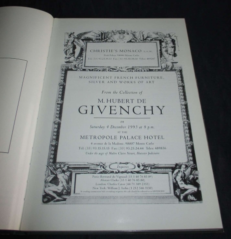 Magníficos móveis franceses, prata e obras de arte da coleção de M. Hubert de Givenchy, Leilão Christie´s, sábado 4 de dezembro de 1993, às 20h, no Hotel Metropole Palace, Monte Carlo, Mónaco.