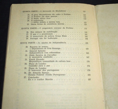 Neste livro o autor dá à estampa alguns acontecimentos antecedentes de 1974 no seio da FRELIMO, como seja a ruptura de Lazaro Kavandame, Miguel Murupa e Uria Simango e revela os principais acontecimentos posteriores à 'revolução dos cravos' que permitiu à FRELIMO, com a complacência e conivência das autoridades civis e militares portuguesas perseguirem e aniquilarem toda a oposição ao partido único.