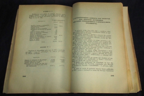 Neste volume pretendi fixar e pedir a atenção dos leitores para alguns problemas e realidades que existem e merecem saliente interesse em Moçambique. Na primeira parte procuro apresentar o panorama do que tem sido ali a vida financeira e suas possibilidades, bem como o mau aproveitamento que tem sido dado aos recursos da Província. (Aspectos e Considerações Gerais; Divisas e Situação Financeira; Crédito e Circulação Fiduciária; Orçamento de Moçambique; Tributação e seus Problemas). Na segunda parte deste trabalho algo se diz a respeito da produção de Moçambique e de alguns aspectos que à mesma interessam (Aspectos Gerais da Produção; Embalagens; Açúcar; Algodão; Castanha de Cajú; O “Kenaf”; Madeiras; Tabaco). Finalmente, na terceira parte deste volume, reúnem-se artigos respeitantes a alguns aspectos sobre Colonização, Fomento e Povoamento.