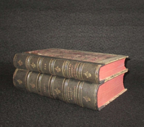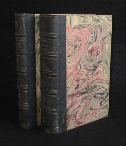 Encadernação cartonada com lombada em pele e ferros a ouro. Obra completa 5 volumes encadernados em 2 tomos. Carimbo de Biblioteca. Discreta anotação numérica.