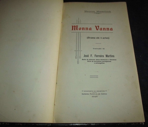 Encadernação de época com lombada em percalina. Título e ferro gravados a ouro na lombada. Preserva capas de brochura. Drama em 3 actos. Tradução de José F. Ferreira Martins.