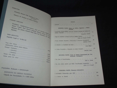 Do índice: Cooperação Técnico-Militar, uma das Vertentes Externas da Política de Defesa Nacional (Gonçalves Aranha); Papel do Ocidente na Busca da Paz no Médio Oriente (Pedro de Pezarat Correia); Forças Armadas Nacionais e Democracia: O Processo Nicaraguense (Belchior Vieira); A Génese e a Condução das Crises (Jesus Bispo); A União Económica e Monetária da União Europeia (Almeida Lopes); The Path of Peace-Keeping (Kofi A. Annan); The UN, CSCE, NATO and WEU: Peacekeeping Cooperation (John O. B. Sewall); Actividades Promovidas pelo IDN; A Defesa do Mundo.