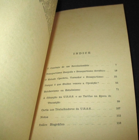 Do índice: O Combate de um Revolucionário; Bonapartismo Burguês e Bonapartismo Soviético; O Estado Operário, Termidor e Bonapartismo; Porque é que Staline venceu a Oposição?; Bolchevismo ou Estalinismo; A Situação na URSS e as Tarifas na Época de Transição; Carta aos Trabalhadores da U.R.S.S..