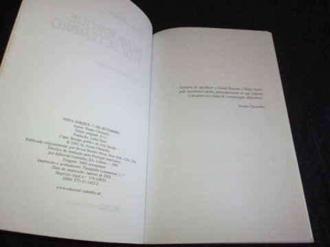 Noam Chomsky foi um dos mais solicitados pela comunicação social para que comentasse o que acabava de acontecer. Da recolha e selecção de inúmeras entrevistas que concedeu a jornalistas de várias nacionalidades, surgiu o livro Nova Iorque 11 de Setembro. Mais do que respostas a perguntas feitas sob o impacto dos recentíssimos e trágicos eventos, encontramos uma profunda reflexão sobre os cenários geopolíticos e sociais que nos rodeiam, uma procura sistematizada das causas e dos efeitos que condicionam a actuação dos centros de poder, os confrontos civilizacionais, económicos e políticos Ocidente-Oriente, o questionamento crítico e objectivo de não olhar a meios para atingir os fins, sejam eles quais forem e o que quer que seja que os determina. Quem são os culpados? Por que se desafia arrogantemente o equilíbrio precário que ainda nos sustenta? Por que são sempre as populações inocentes as maiores vítimas?