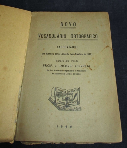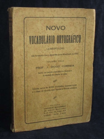 Novo vocabulário ortográfico (abreviado) (em harmonia com o Acordo Luso-Brasileiro de 1945) coligido pelo Prof. J. Diogo Correia. Contém cerca de 40.000 vocábulos, algumas notas e a Base do Acordo que regula a divisão silábica.