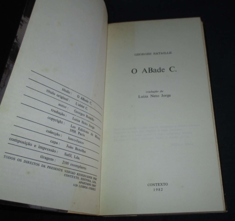 Tradução de Luiza Neto Jorge. Capa de João Botelho. Contado através de uma série de relatos na primeira pessoa, "L' Abbé C" é uma narrativa surpreendente sobre o relacionamento intenso e aterrorizante entre irmãos gémeos. Charles é um libertino moderno, dedicado ao vício e à depravação, enquanto o seu gémeo Robert é um padre tão devoto que é apelidado de "O abade". Quando a sexualmente selvagem Eponine se intromete no seu relacionamento sufocante, surgem angústia, delírio e morte.