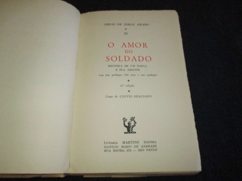 História de um poeta e sua amante (em um prólogo, três atos e um epílogo). Capa de brochura. Capa de Clovis Graciano. O Amor do Soldado é uma peça de teatro que Jorge Amado escreveu em 1944 a pedido da actriz Bibi Ferreira. Nela se conta a vida de Castro Alves, o poeta, o construtor da democracia, o militante da liberdade.