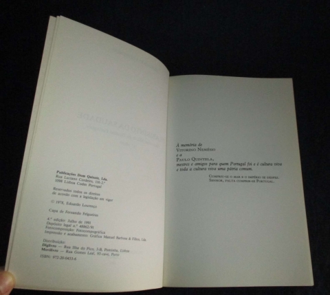 Psicanálise Mítica do Destino Português. Capa de brochura. Capa de Fernando Felgueiras. Somos, enfim, quem sempre quisemos ser. E todavia, não estando já na África, nem na Europa, onde nunca seremos o que sonhámos, emigrámos todos, colectivamente, para Timor.