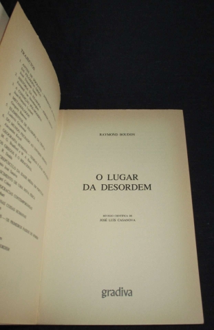 Sublinhados a marcador. Capa de brochura. Revisão Científica de José Luís Casanova. Ao invés de constituir um lugar comum O Lugar da Desordem apresenta-se como uma crítica construtiva das teorias da mudança social, pontuada com uma selecção criteriosa de exemplos verdadeiramente absorventes, que perfaz um dos textos mais interessantes de R. Boudon. José Luís Casanova, Sociólogo, ICS Sociologia.